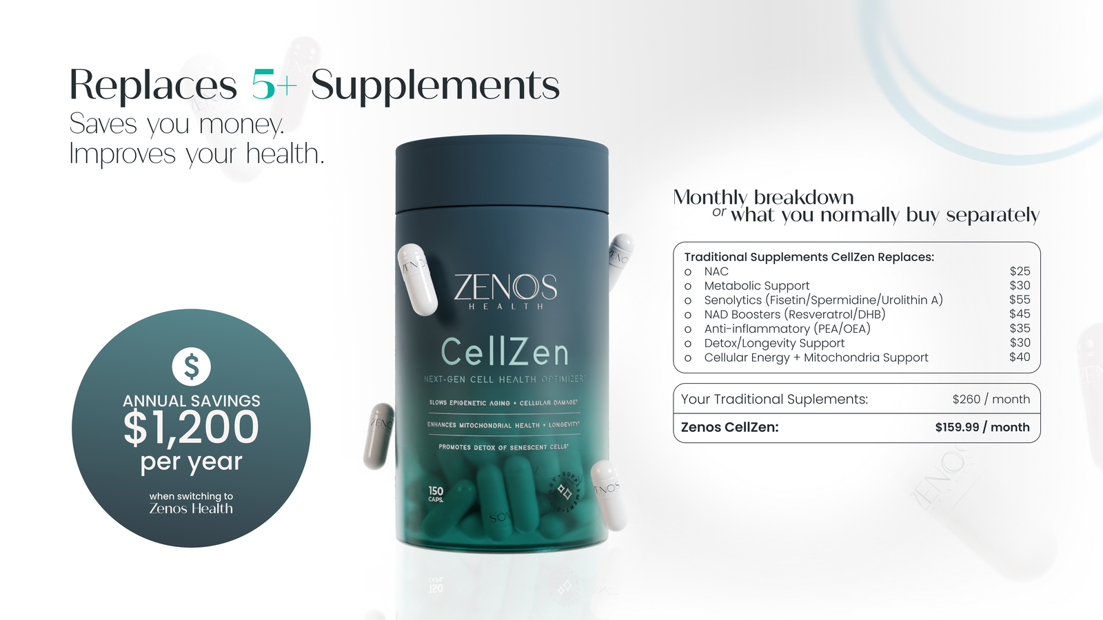 Senescent cells are old or damaged cells that have stopped dividing but refuse to die. They accumulate with age and release inflammatory compounds that damage surrounding healthy cells. CellZen contains senolytic compounds like Quercetin and Fisetin that help promote the clearance of these problematic cells, supporting healthier tissue function.