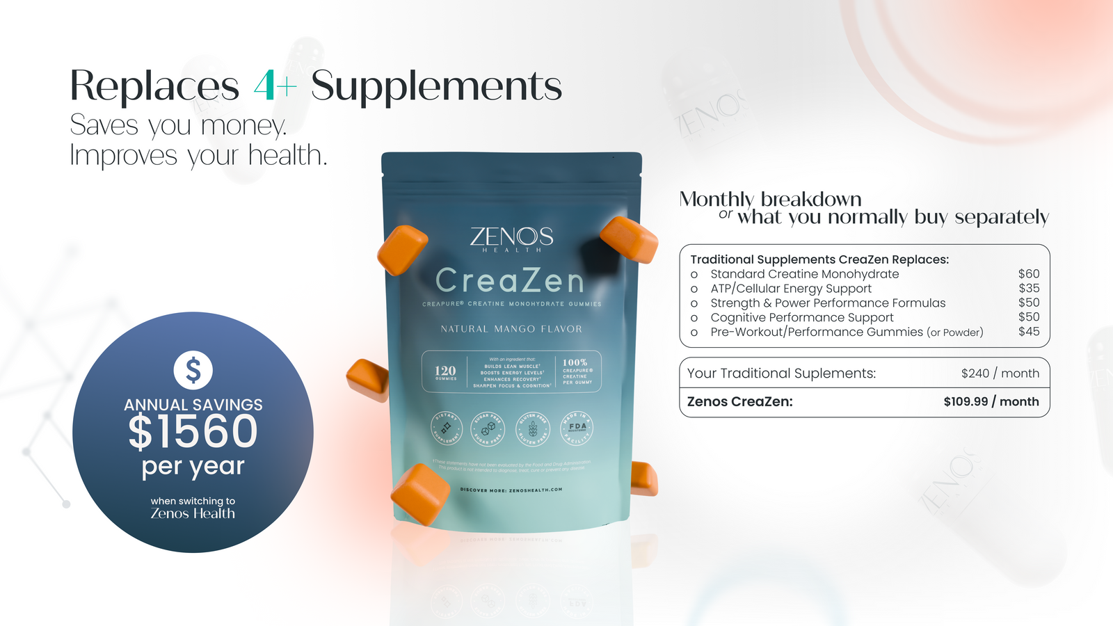 CreaZen delivers 5000mg of CreaPure® creatine monohydrate in each serving. Once consumed, creatine is absorbed through the digestive system and enters the bloodstream, where it's transported to muscles and other tissues that require high energy.